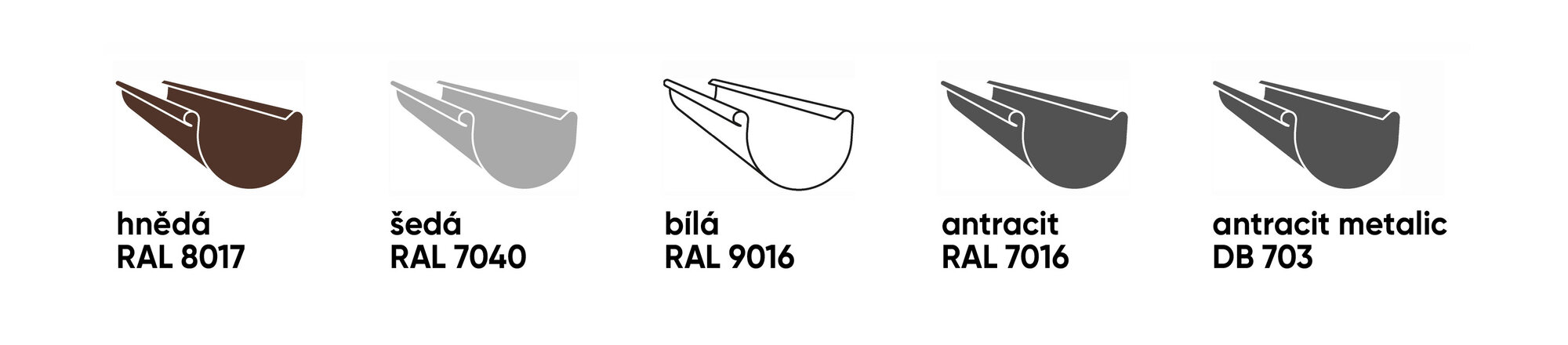 Okapy MARLEY dodáváme v pěti barevných odstínech: hnědé, šedé, bílé, antracitové a nově také v barvě antracit metalic.